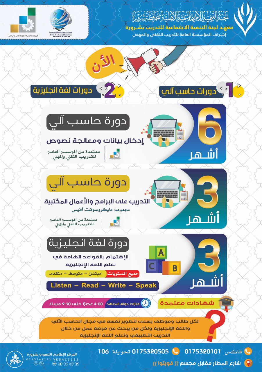 معهد التنمية بشرورة Ar Twitter معهد التدريب الرجالي بشرورة يعلن عن بدء التسجيل في دوراته التدريبية المعتمدة حسب الإعلان المرفق للتسجيل الرجاء زيارة المعهد شارع المطار مقابل مجسم قويتوا للاتصال والاستفسار